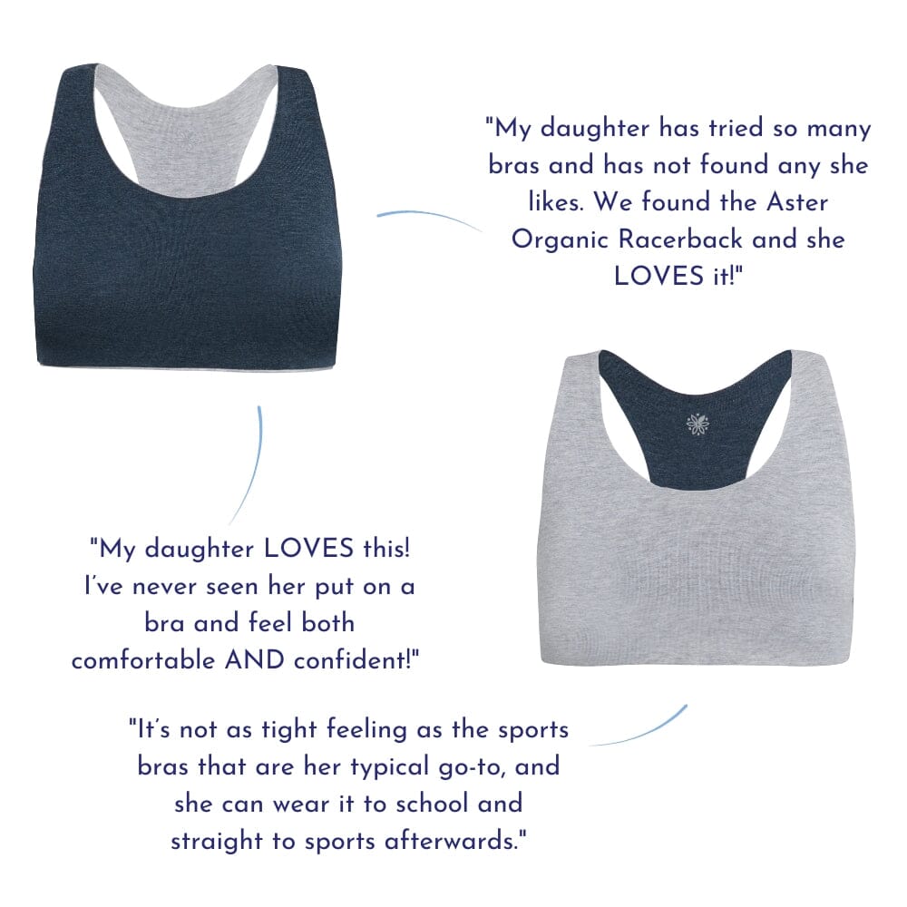 Our Aster Racerback is super soft, reversible sports bra made in sustainable fabrics. Made of buttery soft TENCEL™ Lyocell Organic Cotton Spandex Jersey with a wider band, our Aster Racerback Bra gives you added support, so she’s got your back.